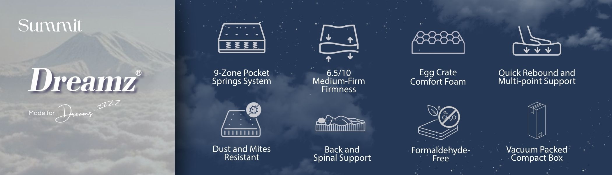 Introducing Dreamz SUMMIT, the Bamboo Charcoal Pocket Spring Mattress with 35cm thickness, you can experience deep and restful sleep, feeling awaken and refreshed the second day.