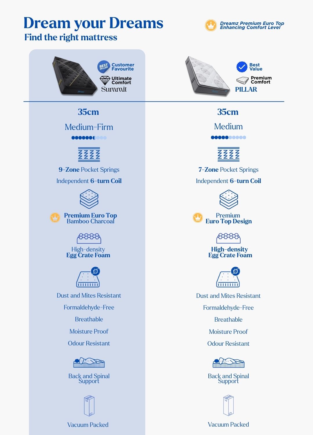 Dont’ worry! We have just picked our premium mattress PILLAR and compared their key features for you, so you can easily find your best Dreamz without hassle.