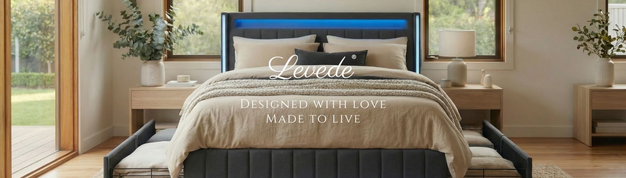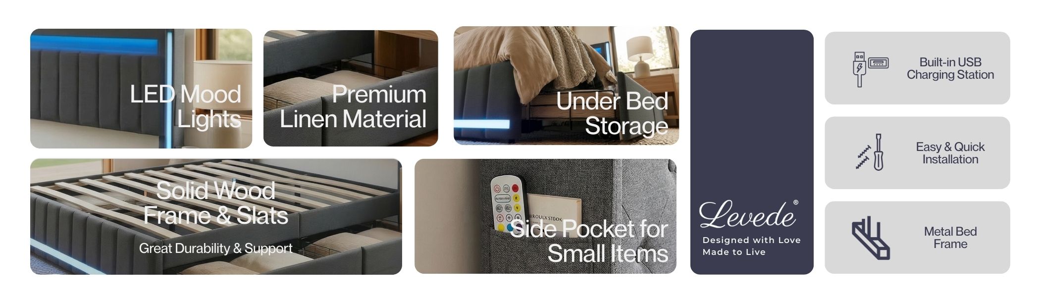 Built on a sturdy metal and solid wood structure, this queen bed frame with storage includes four smooth-gliding drawers with dust pads, ideal for storing bedding, clothes, or everyday essentials. The ergonomic, linen-upholstered headboard adds a soft touch, while dual USB ports and power outlets keep your devices charged without clutter. Thoughtfully designed and quick to install, it’s the ultimate blend of form and function.